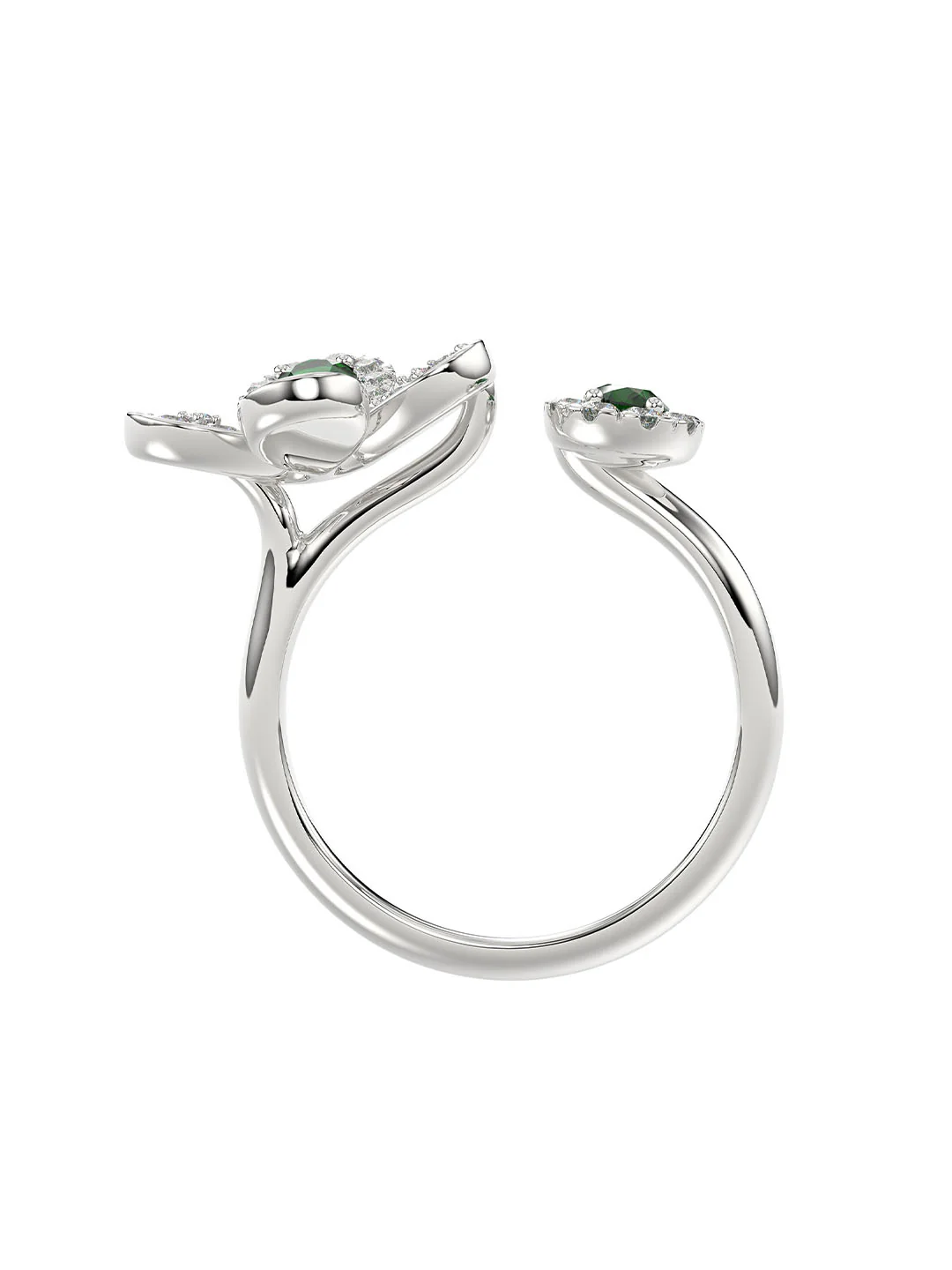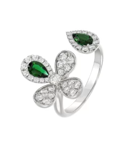 The Floral White Gold Ring features an 18 karat white gold band set with diamonds. The open ring is enriched with a diamond four-leaf clover and teardrop-shaped natural emerald with pavé diamonds.