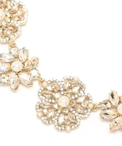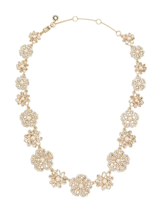 The Fresh Floral Collar Necklace alternates between geometric gold flowers and crystal-outlined five petal flowers with a faux pearl at the center. The statement gold necklace is featured in a gold tone with gold hardware and measures 16 inches in length with four length options.