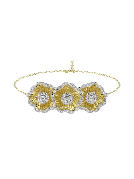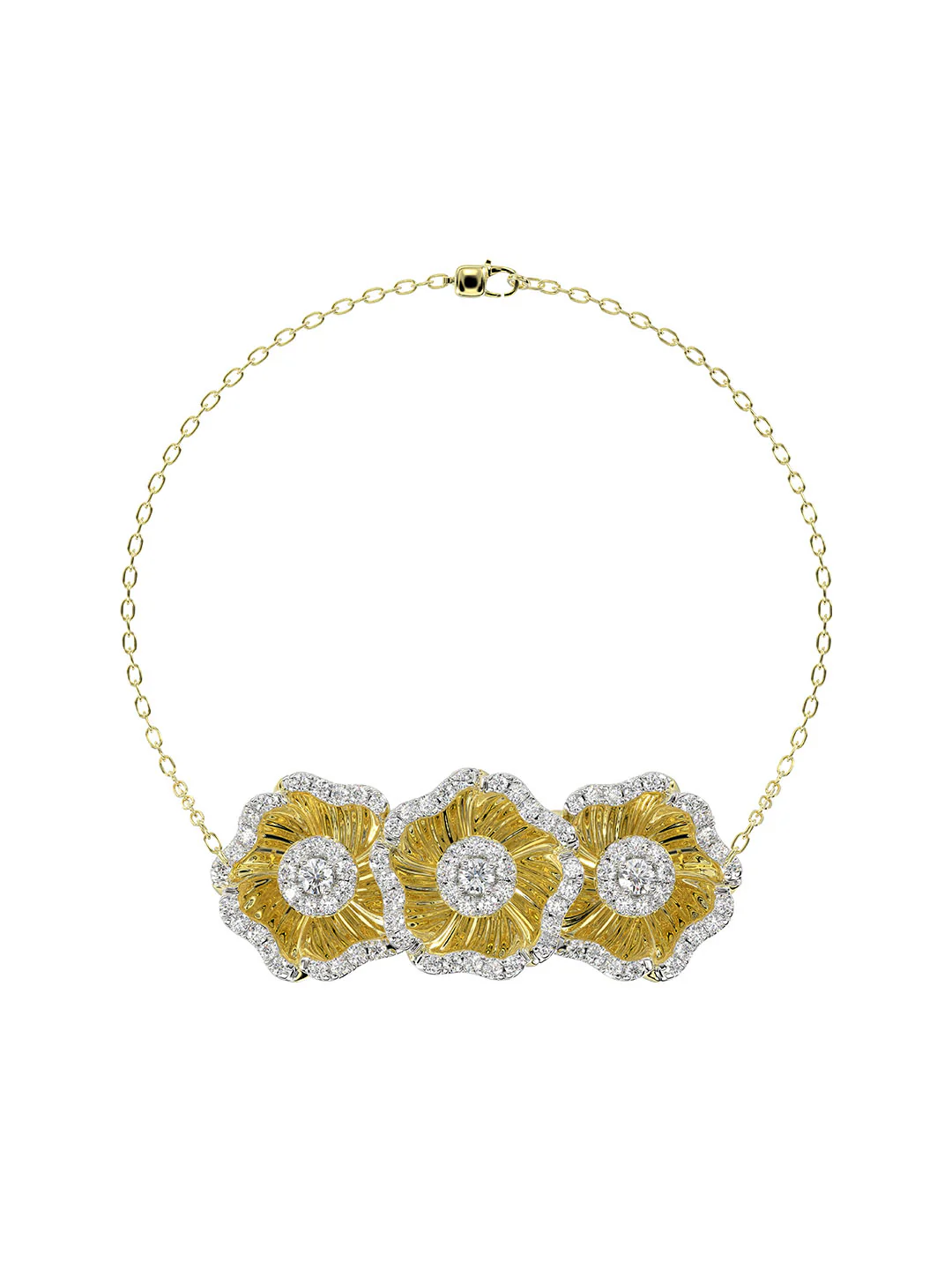 The Halo Flower Yellow Gold Bracelet is an 18 karat yellow gold delicate chain with a trio of rose gold and natural diamond camellia-inspired flowers at its center.