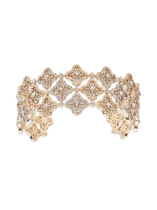 The Lace Cuff Bracelet is a lattice of pavé stars. Translucent crystals adorn the cuff, making for a thoughtfully detailed piece. The statement bracelet is gold plated with a gold tone.