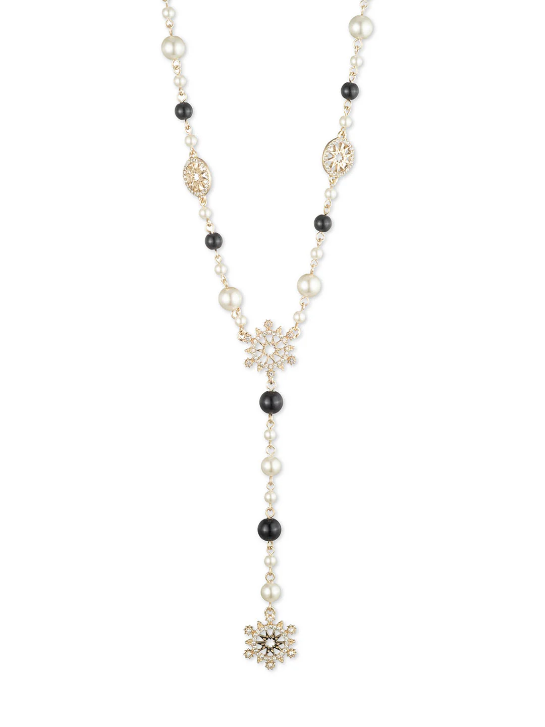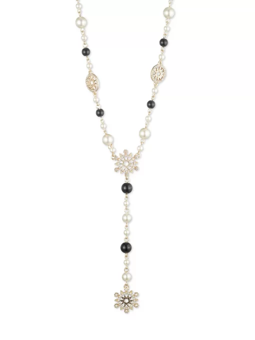 The Pearl Y Necklace features a pattern of petite gold links and faux black and white pearls, complete with geometric floral charms. The statement gold necklace is featured in a gold tone with gold hardware and measures 16 inches in length.