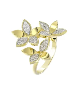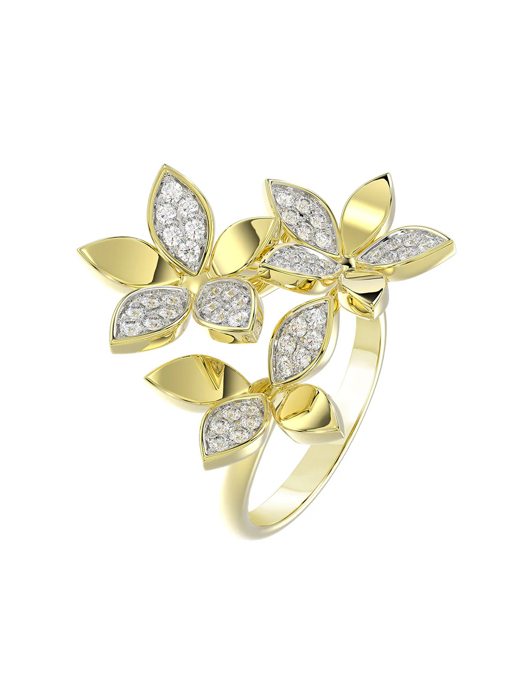 The Wild Flower Yellow Gold Ring features a yellow gold open band set with pavé diamonds and complete with a trio of dynamic teardrop-shaped diamond and yellow gold flowers.