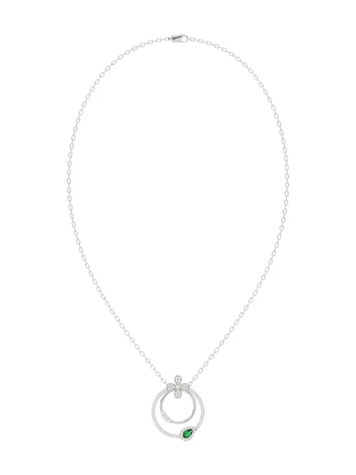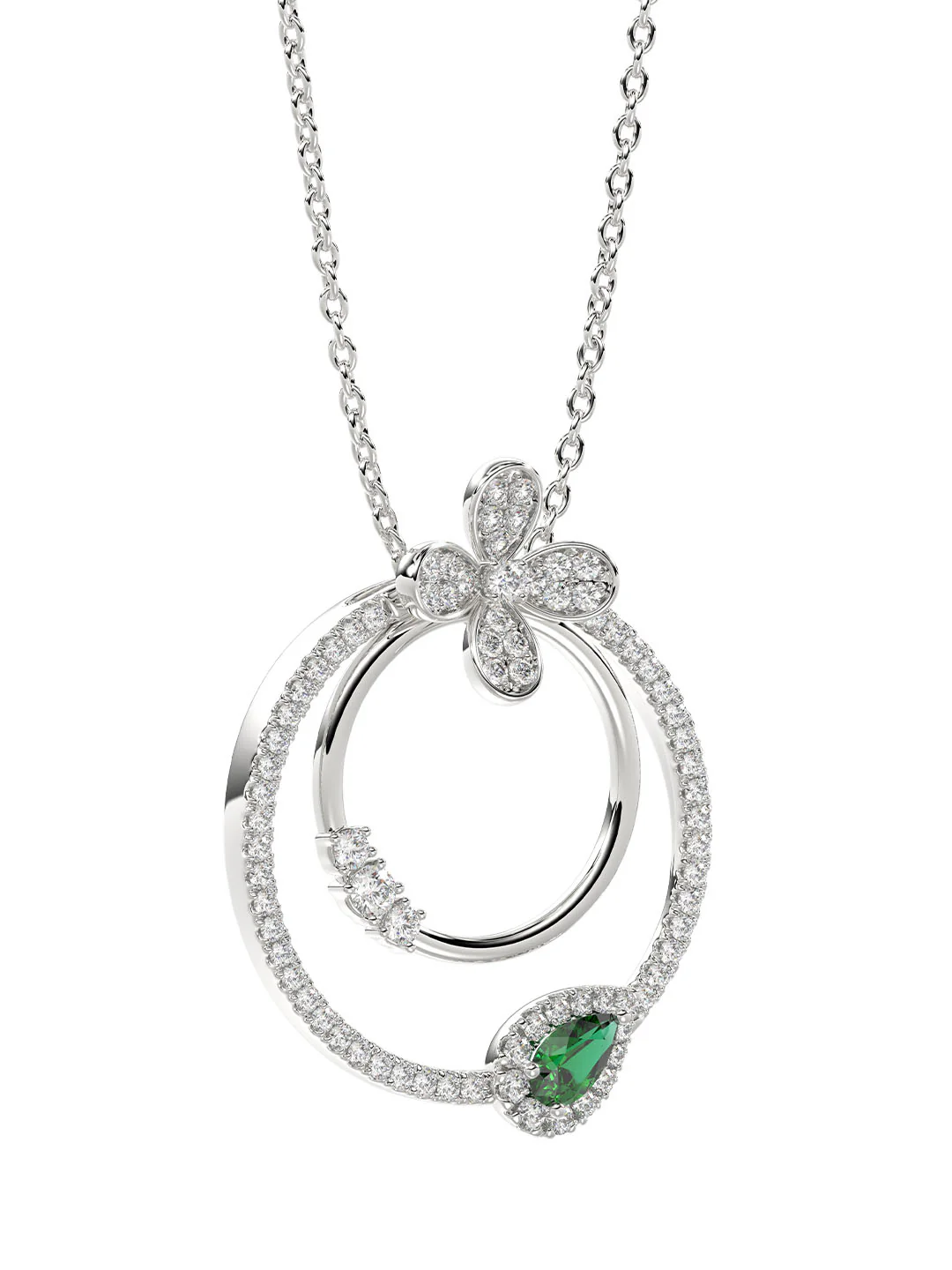 The Floral White Gold Pendant Necklace is an 18 karat white gold delicate chain with concentric white gold hoops. The larger of the rings is set with diamonds, while the smaller companion ring is adorned with three delicate offset diamonds. The pendant is complete with a diamond four-leaf clover set at the apex and teardrop-shaped natural emerald near the bottom.