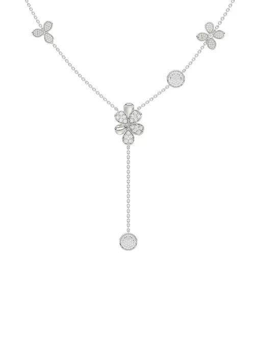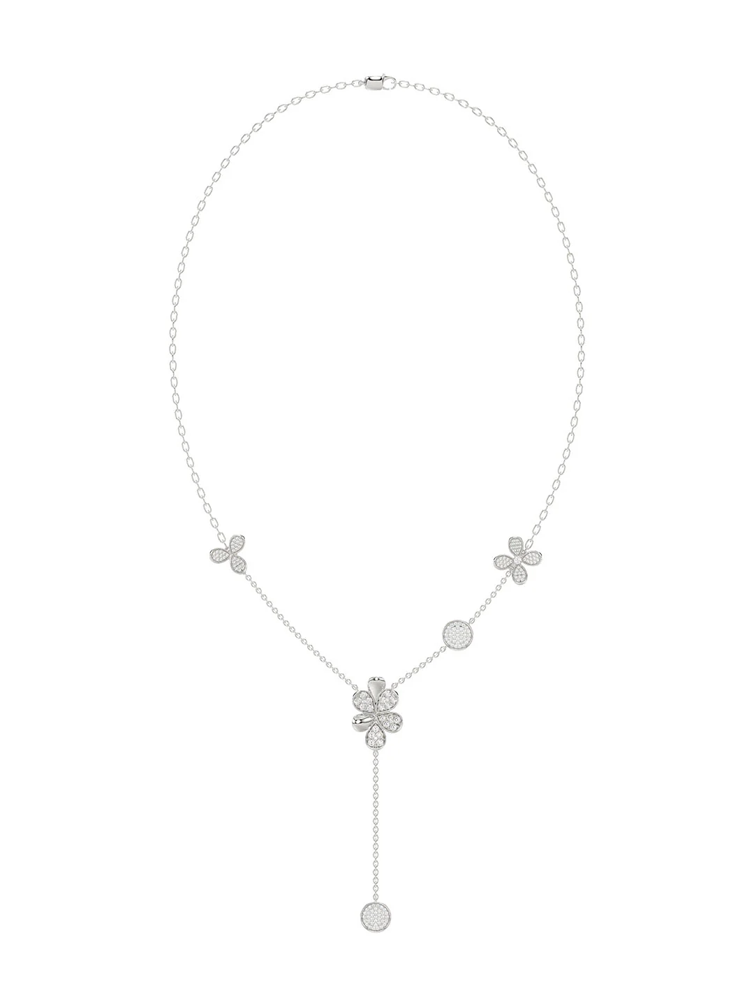 The Floral White Gold Y Necklace is an 18 karat white gold chain with a diamond six-petal flower at its center. The delicate chain is blossoming with flowers and circular diamond discs.