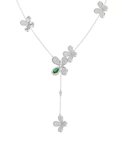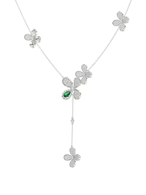 The Floral White Gold Y Necklace is an 18 karat white gold chain with a diamond and natural emerald four-leaf clover at its center. The delicate chain is blossoming with diamond-set flowers.