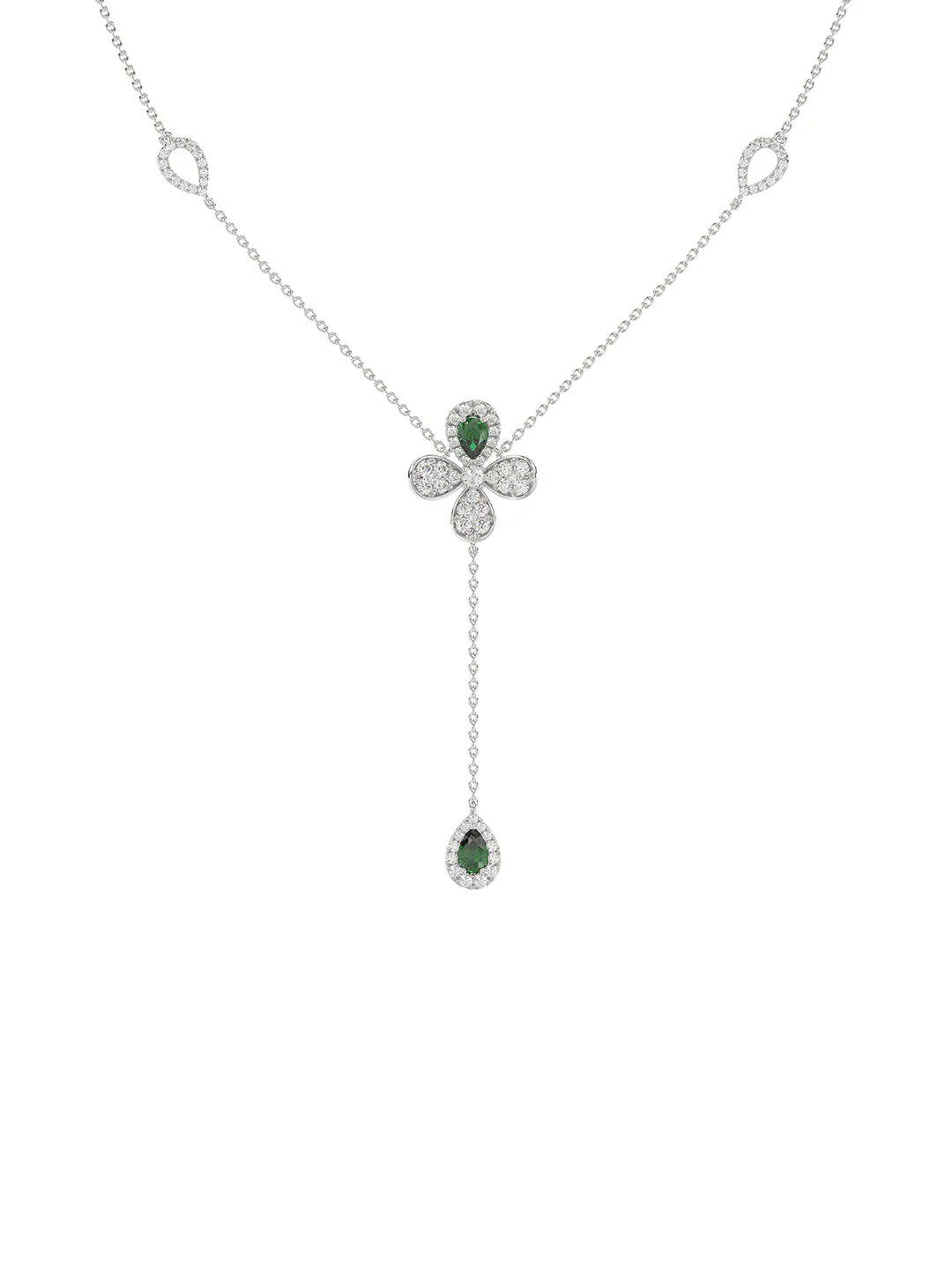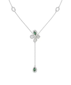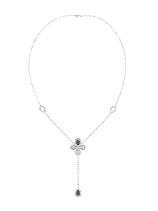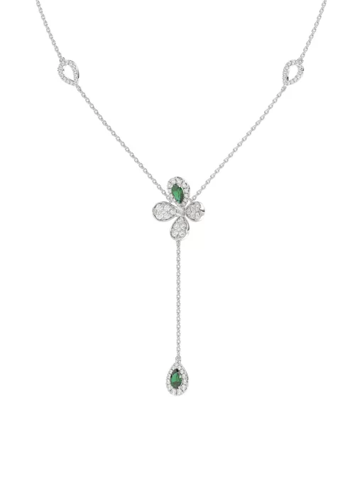 The Floral White Gold Y Necklace is an 18 karat white gold delicate chain with a diamond and natural emerald four-leaf clover at its center. A delicate teardrop-shaped diamond pavé emerald holds onto the clover by a white gold chain.