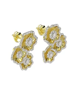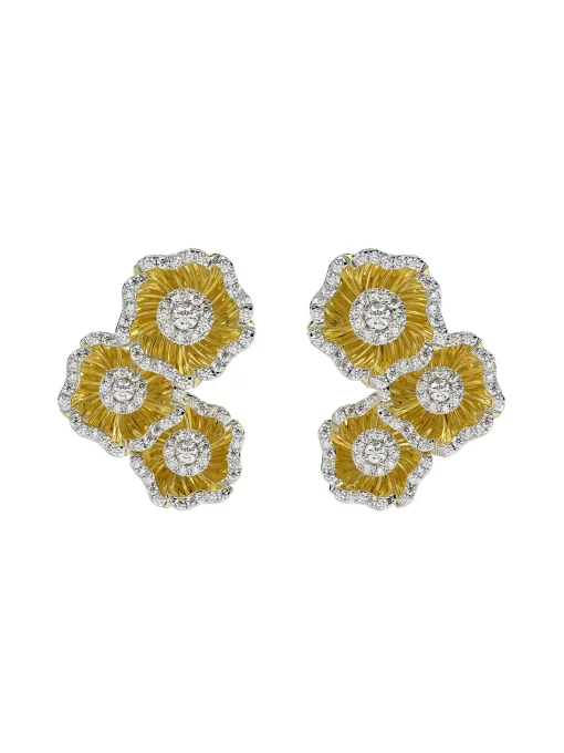 The Halo Flower Yellow Gold Earrings feature a trio of yellow gold and natural diamond camellia-inspired flowers, complete with a natural diamond at the center of each flower.