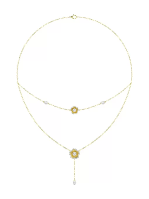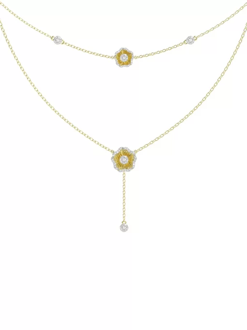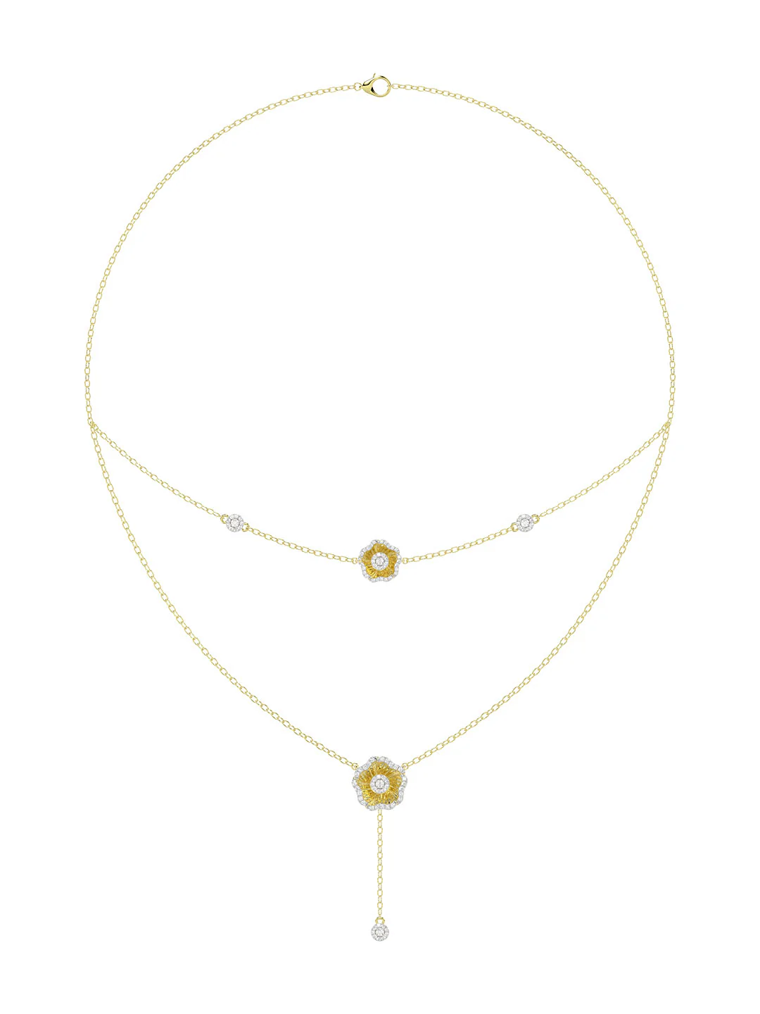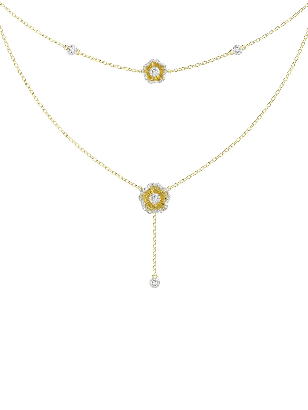 The Halo Flower Yellow Gold Necklace is an 18 karat yellow gold layered necklace. A petite yellow gold and natural diamond camellia-inspired flower sits at the center of the top row, accompanied by diamonds on either side. The second row is a y-necklace with a flower at the center and a natural diamond hanging below.