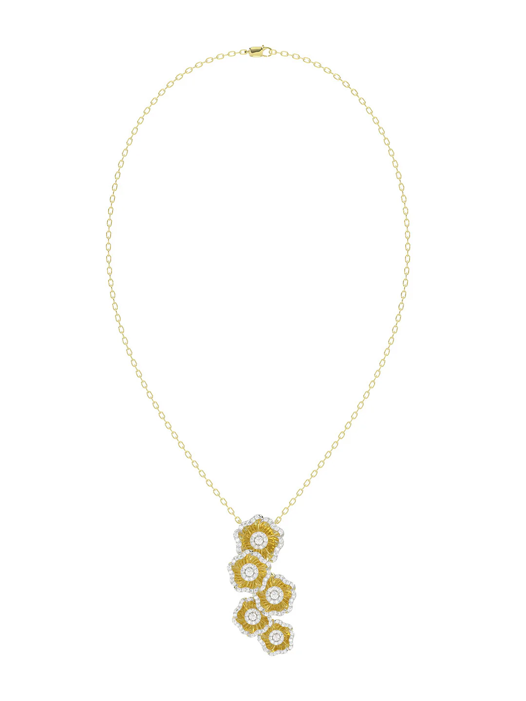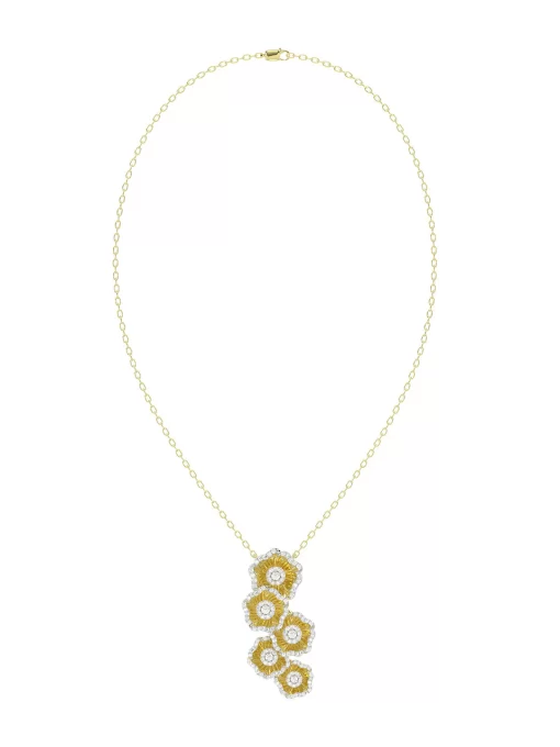 The Halo Flower Yellow Gold Necklace is an 18 karat yellow gold delicate chain with a pendant composed of five staggered gold and natural diamond camellia-inspired flowers.