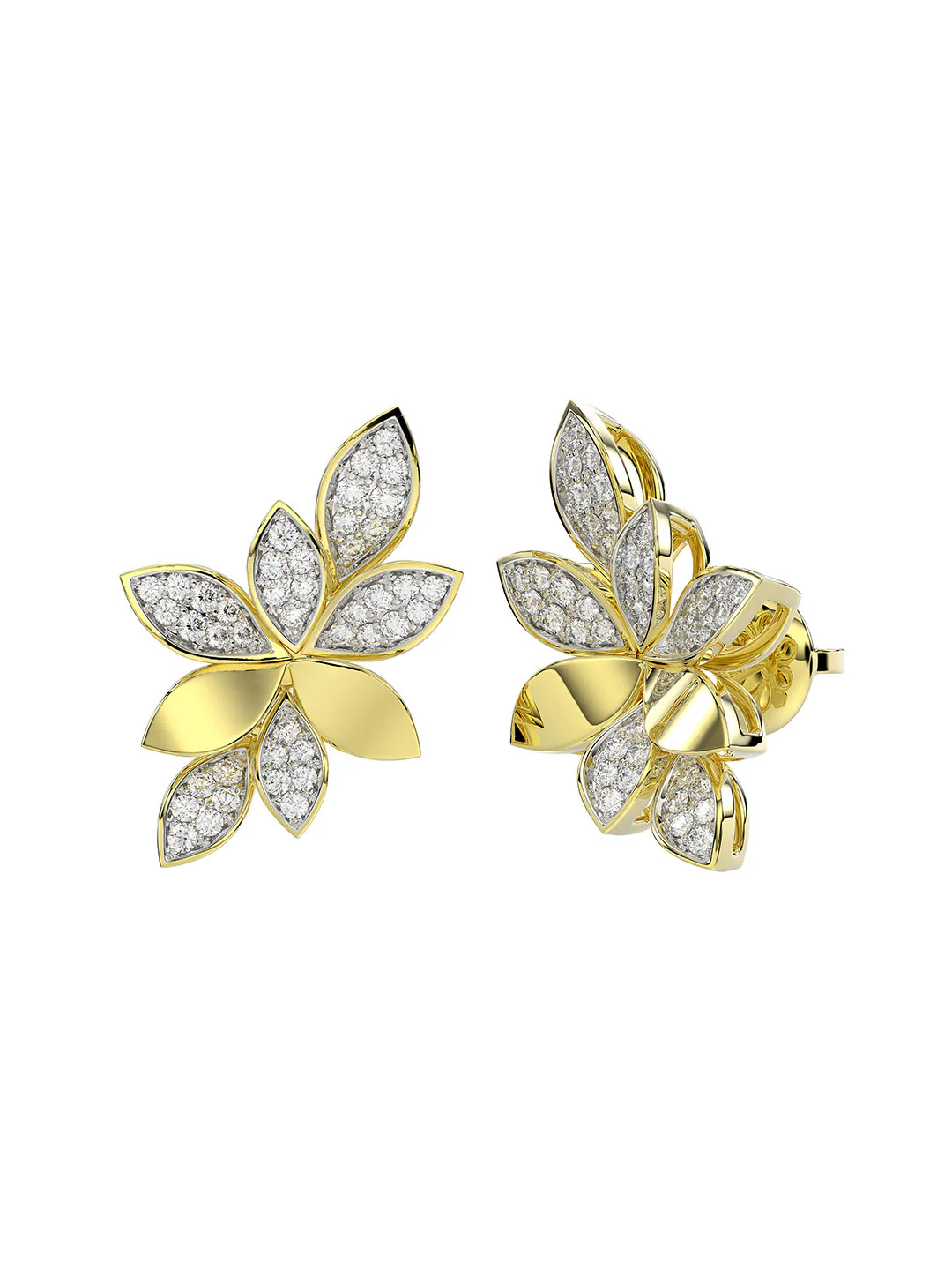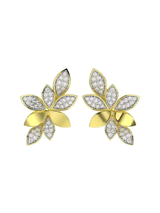 The Wild Flower Yellow Gold Earrings feature dynamic teardrop-shaped diamond petals set in yellow gold. Solid yellow gold petals are scattered among the natural diamonds.