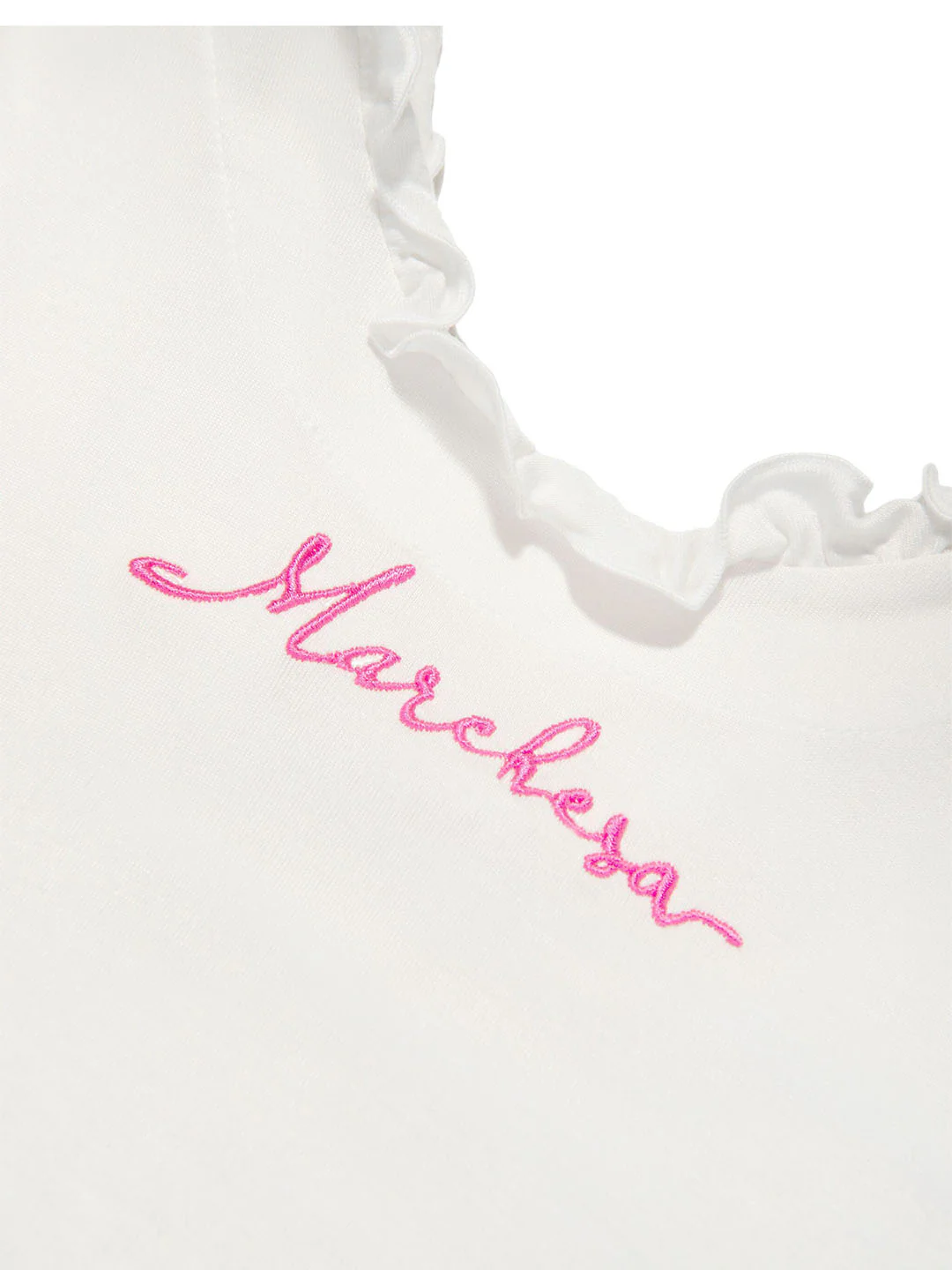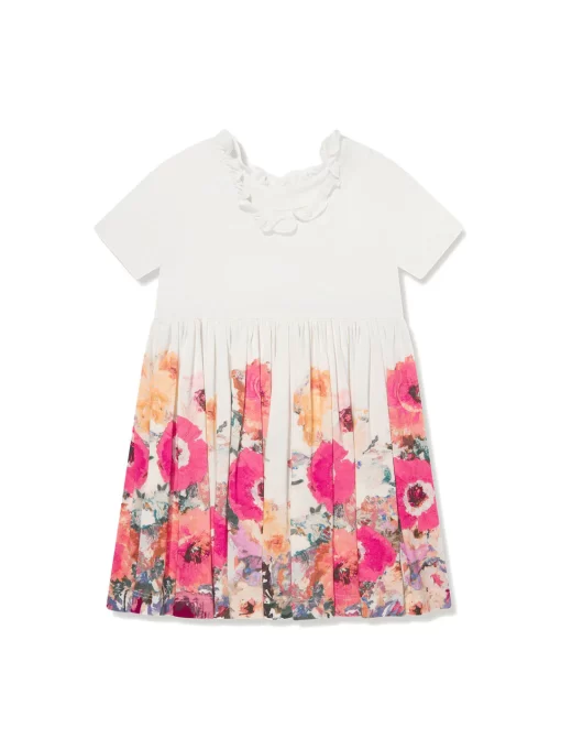The Marchesa Jersey Dress features a round neckline, short sleeve, and pleated skirt. The a-line dress is complete a Marchesa signature across the bodice and signature Marchesa watercolor flowers blooming on the skirt.
