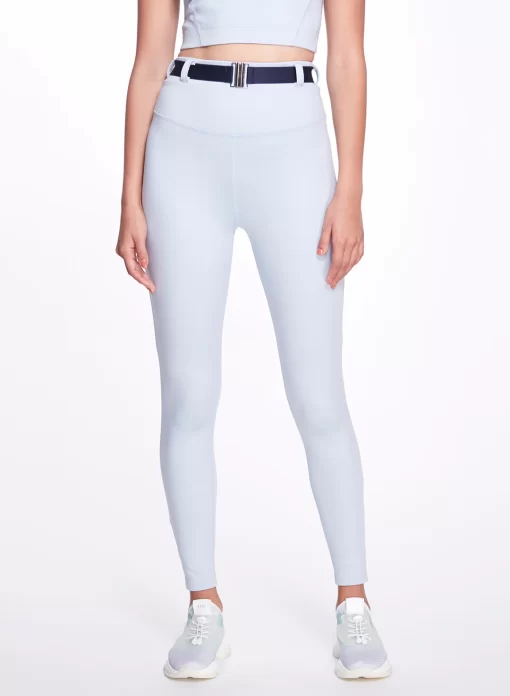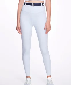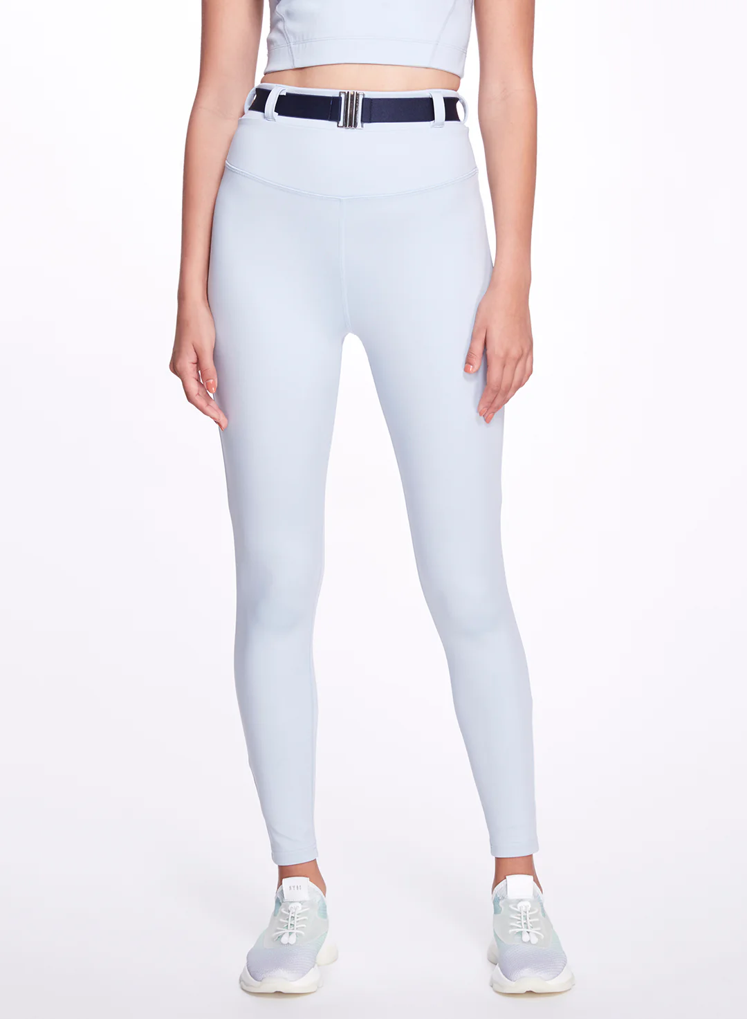 The Ava Bra is a pale blue light weight, fitted, and compression brami with a scoop neck. It features complementary blue detailing on the sides.
