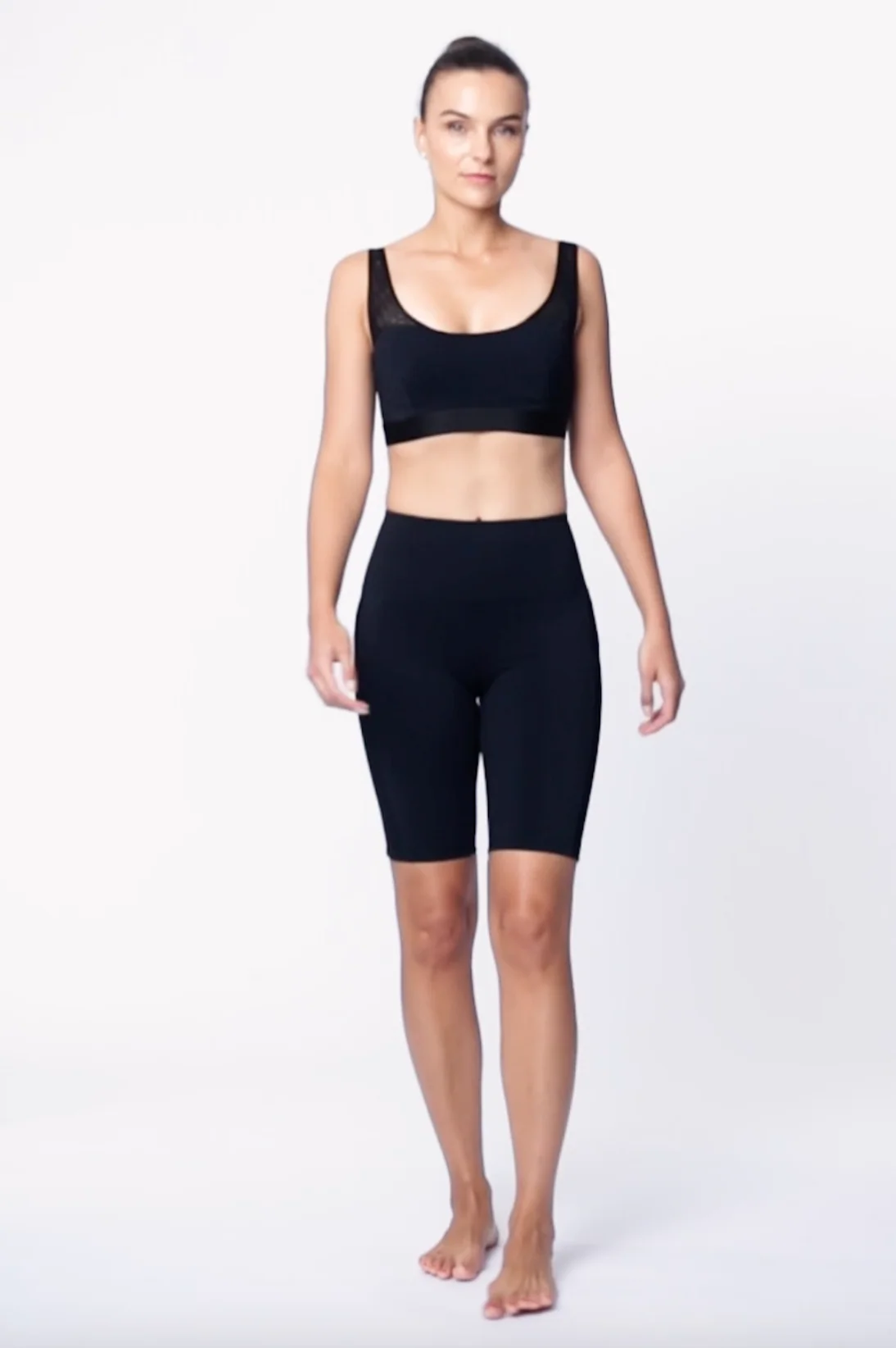 The Ashlyn Short is a black high waisted and knee length short featuring fun lace-up back detailing and power mesh sheer slit pocket details on the sides. These details combined with the compression fit and super smooth performance fabric make these shorts perfect for wearing anywhere and everywhere!