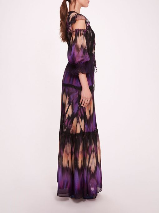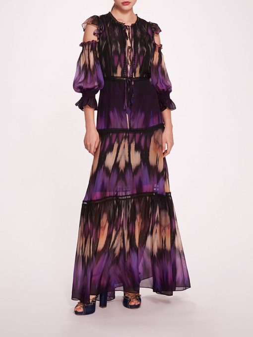 The Abstract Viscose Maxi Dress is a vision of modern sophistication, boasting an abstract print on silk viscose fabric. Its tied front details and ruffled cold shoulder add a contemporary flair, while the tiered body with hem ruffle creates a graceful silhouette. Delicate lace trims and smocked cuffs complete the look.