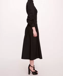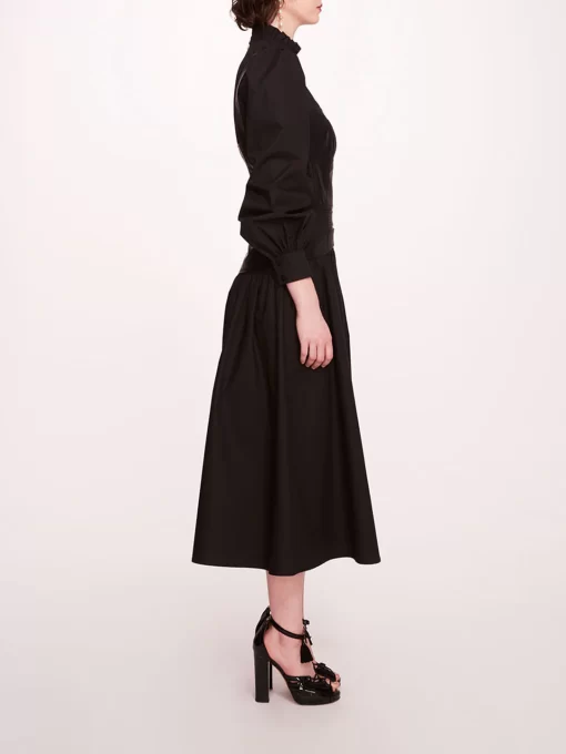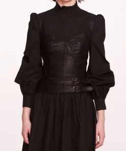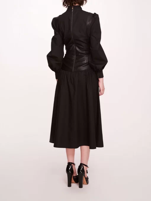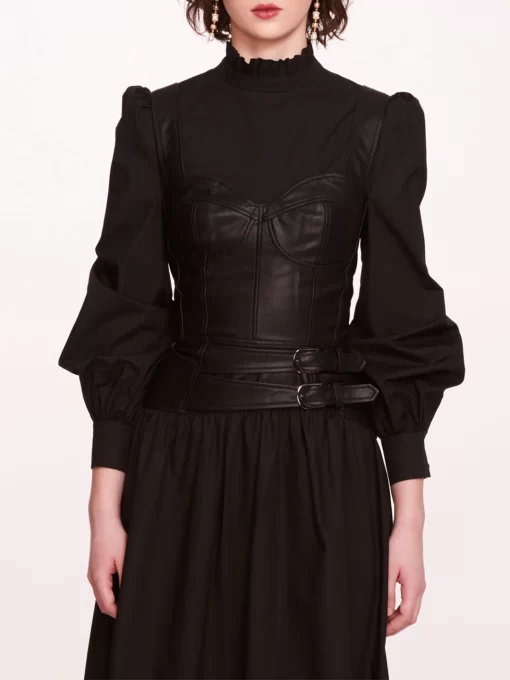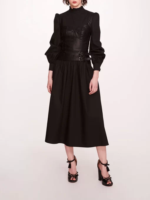 The Faux Leather Poplin Corset Dress is a blend of cotton and faux leather, showcasing bold leather bustier corset details for a chic silhouette. Featuring a peplum belt and a flowing cotton swing skirt, this midi dress is complete with a ruffled collar, cuffed sleeves, and contrast metal zipper.