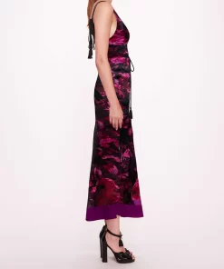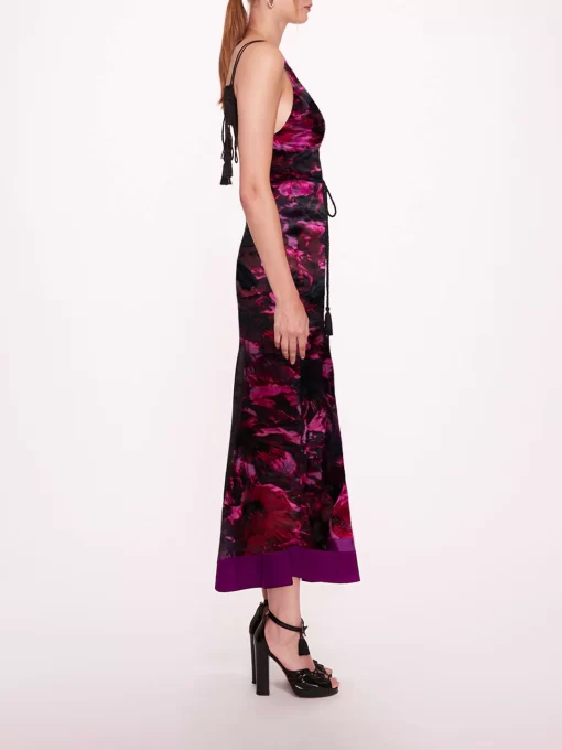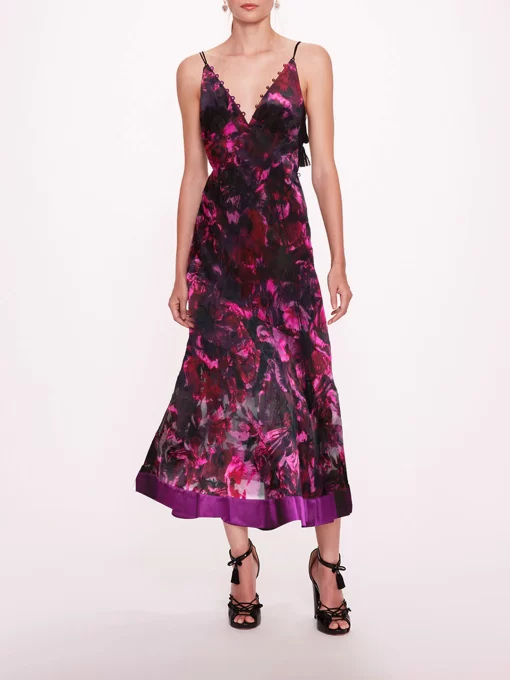 The Niobe Slip Dress is a bias slip dress featuring a v-neckline and tassel straps. Niobe is crafted with burnout satin and completed with button details and a separate tasseled rope belt.