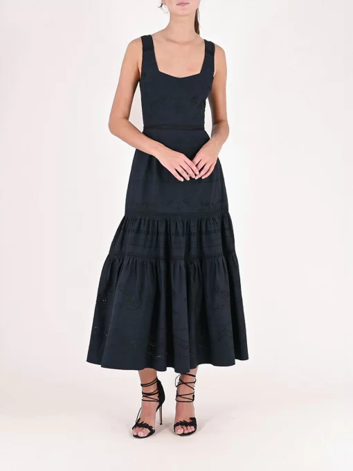The Voile Tiered Maxi Dress features a tiered a-line silhouette with a sleeveless bodice and scoop neckline. Crafted from cotton broderie angliase, this crisp lightweight dress is complete with woven lattice trim details.