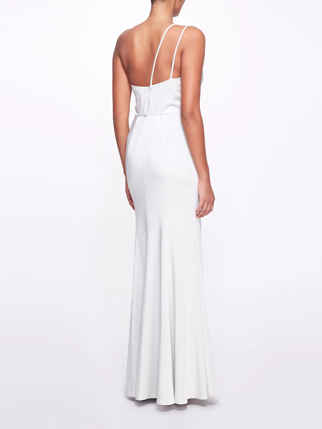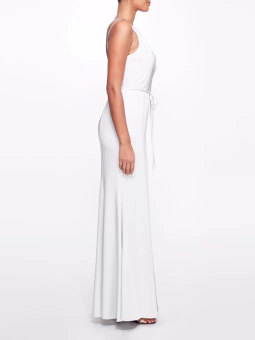 Bloom all year round in the Novara gown in dove grey. Featuring a refined one-shoulder design with a dainty double strap, a graceful waist tie, a subtle keyhole, and a classic front leg slit, this dress is chic and sleek.