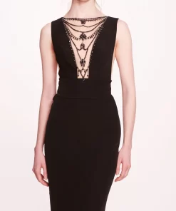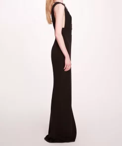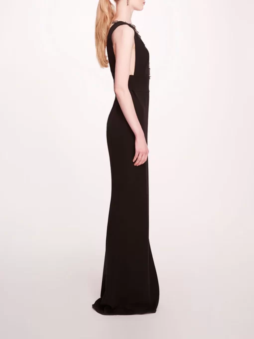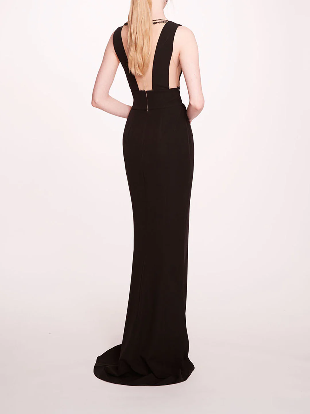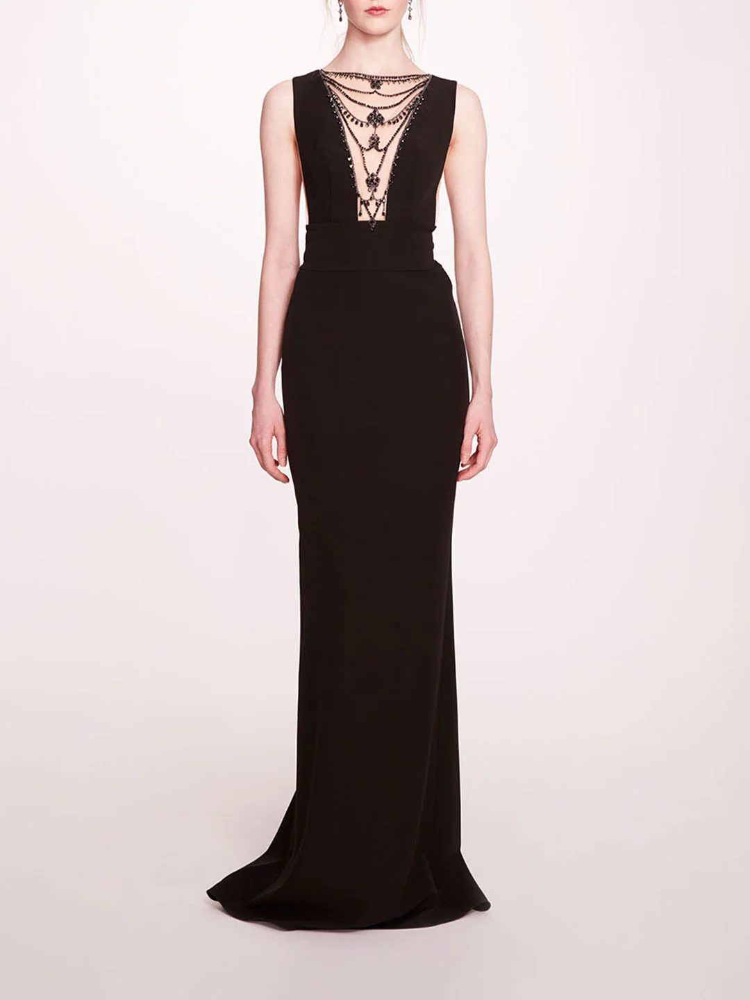Shine in the Jewel Embellished Column Gown, designed with a deep v-neckline and stunning jewel embellishments that elevate its elegance. Crafted from luxurious crepe, this gown features mesh inserts on the front, back, and side panels for a modern touch.