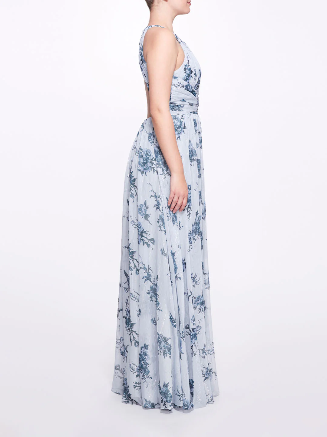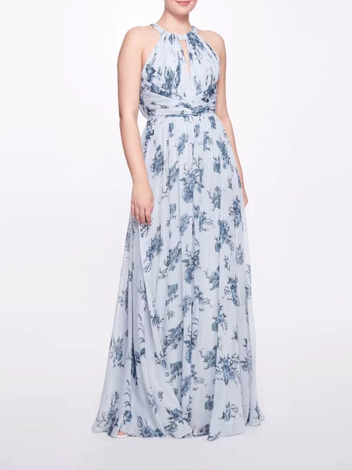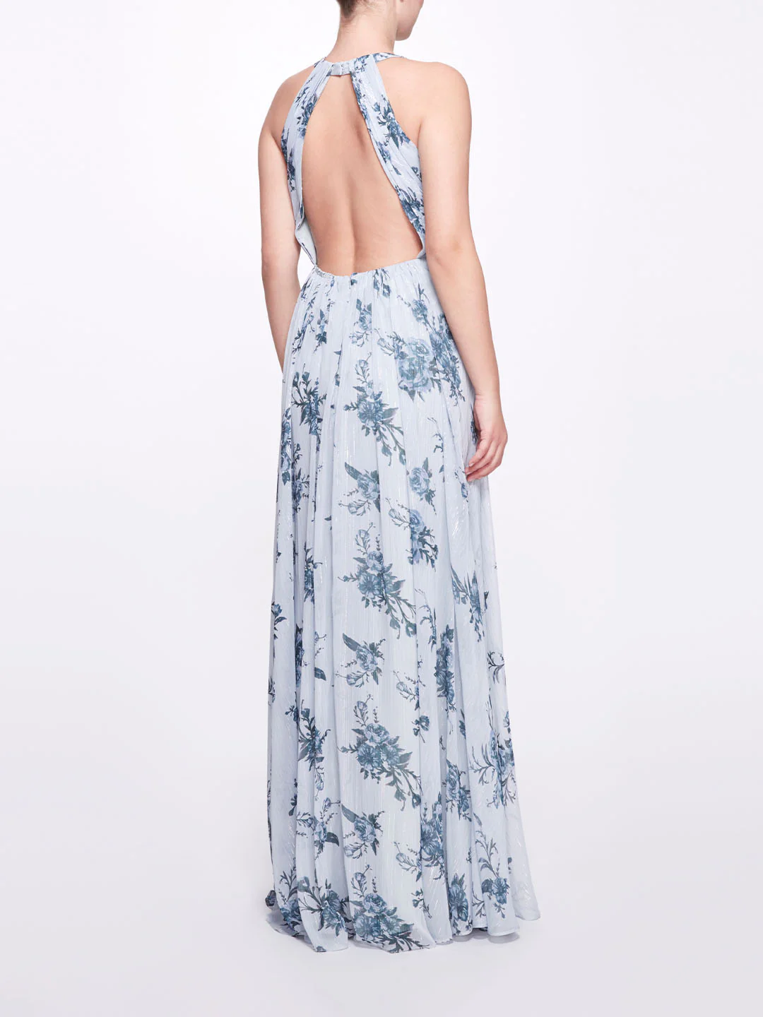 The Carrara gown in dusty blue is a floral paradise. Featuring a printed lurex floral chiffon, a rounded halter neck, an open back, and a key-hole neckline, this dress is as graceful as a doe.