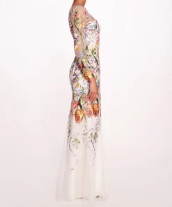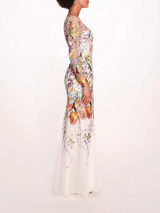 The Ribbons Long Sleeve Gown is a long sleeved v-neck gown with a fit-to-flare silhouette and slit on degrade embroidered tulle.