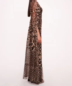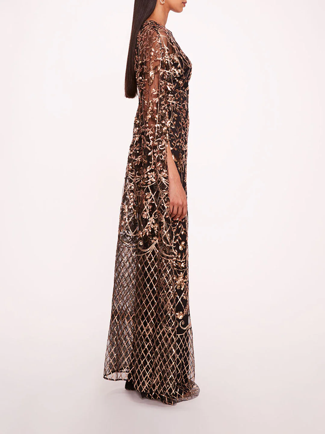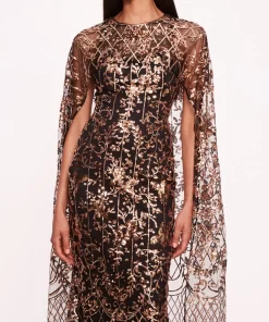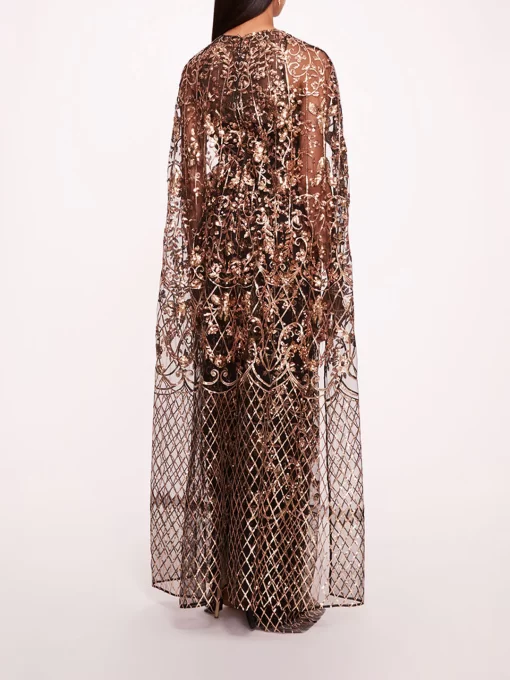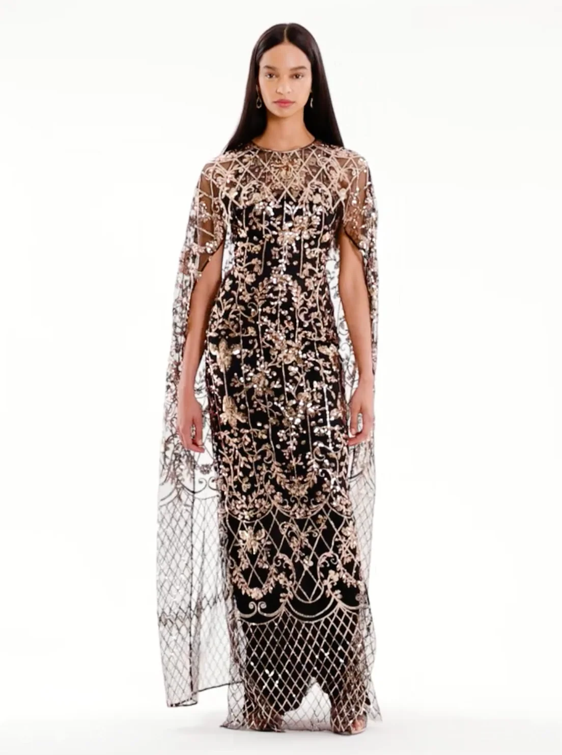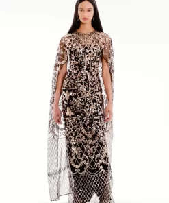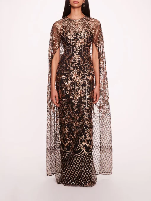 Marchesa Notte Bridal Women’s Eveningwear Sequin Lattice Cape Gown | Black Gold