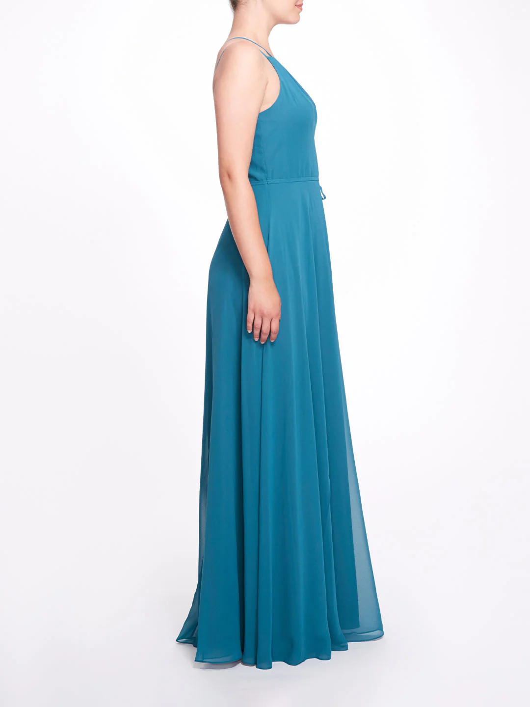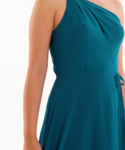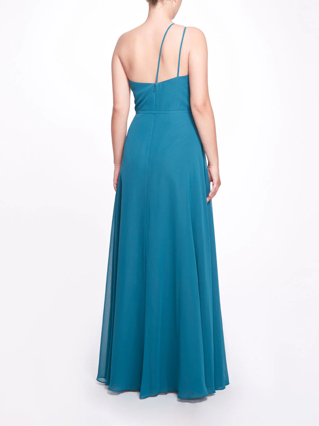 The Pescara gown in emerald is the epitome of glamour. Featuring a one-shoulder design, peekaboo detail, and a tie at the waist, the dress is subtly romantic.