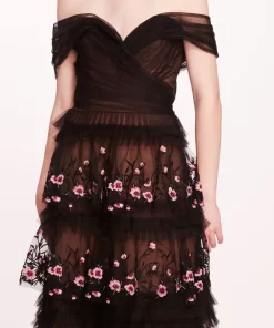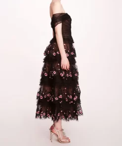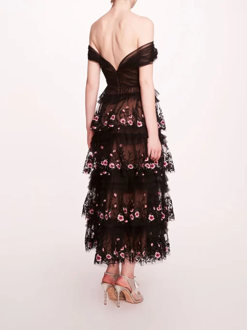 Elevate your style with the Tiered Terrarium Midi Dress, a charming off-the-shoulder tea-length design that exudes feminine elegance. The draped bodice is accompanied by a tiered tulle skirt adorned with exquisite terrarium embroidery.