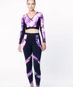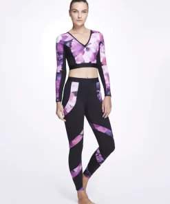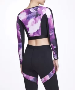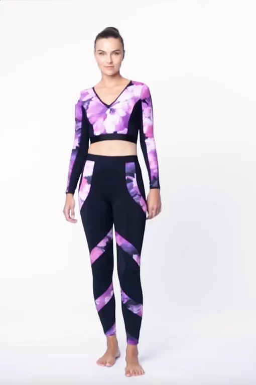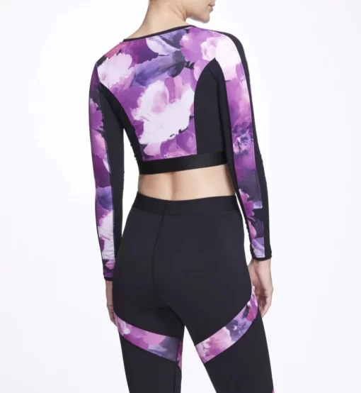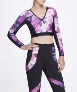 The Louisa Top is a v-neckline cropped long sleeve top. The lightweight and smooth compression fit, raspberry multi floral print, black accent underband and super smooth performance fabric make this the perfect gym top for cooler weather.